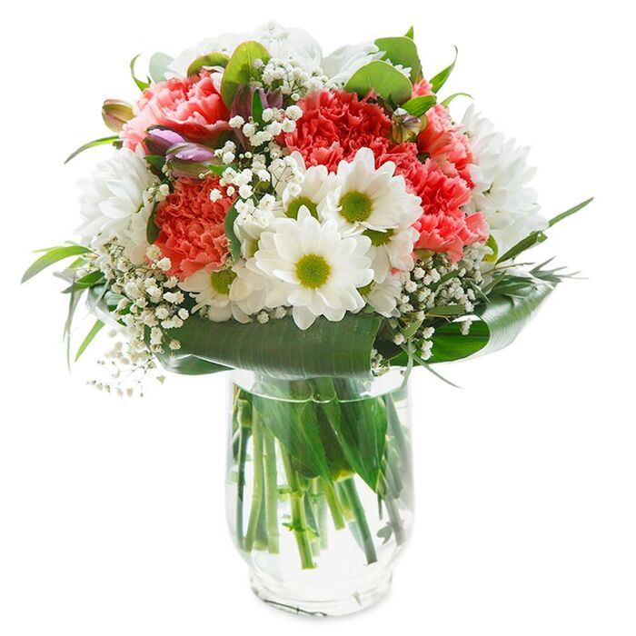 Add a touch of majesty to any occasion with our stunning floral arrangement. This bouquet unifies the delicate beauty of snow-white chrysanthemums, elegant gypsophila, and light pink carnations, all perfectly framed by verdant aspidistra leaves. Each bloom is hand-selected from the finest sources, ensuring that every petal speaks of superior quality and freshness.